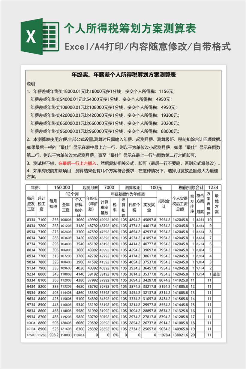 本测算表使用方便,全部公式设置,测算时只需输入年薪、起测月薪、测算级距、税前扣除合计四项数据。