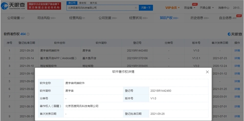 北京百度网讯科技有限公司新增一条软件著作权登记信息,软件全称为“度宇宙终端软件”,简称“度宇宙”,登记号2021SR1442480,当前版本号为V1.0。