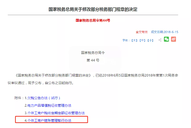 2018年6月15日公布的《国家税务总局关于修改部分税务部门规章的决定》(国家税务总局令第44号)附件4《个体工商户建账管理暂行办法》对个体工商户建账提出了明确要求: